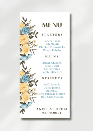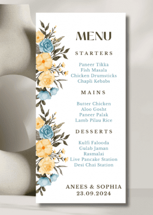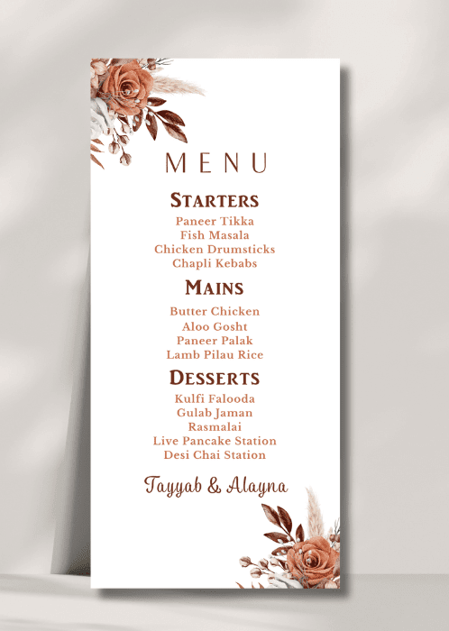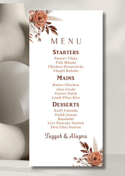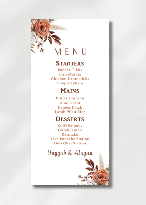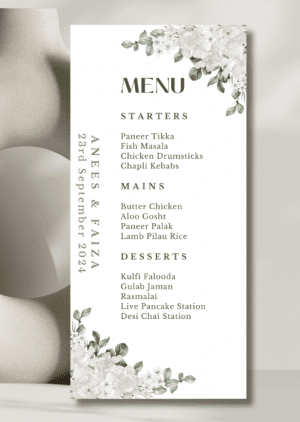 The card delicately displays your names along with the delicious details of your starter, main course and dessert options.