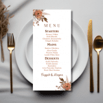 Our elegant Autumnal Tones Menu announces all the dining details in store for your beloved guests. This beautiful design features a white background with watercolour illustrations of flowers in autumnal tones.