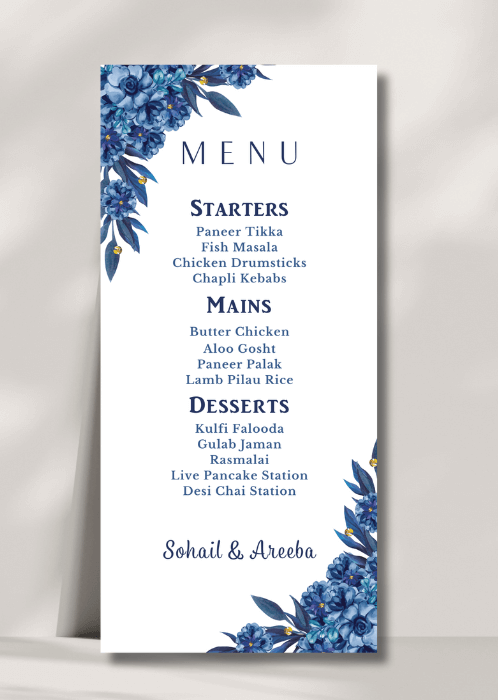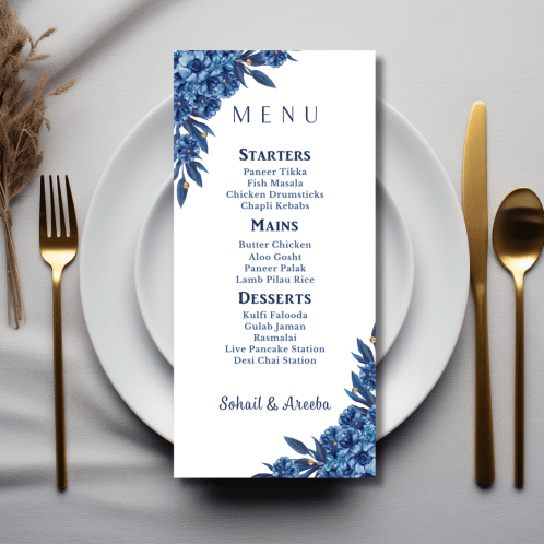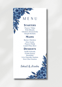 The card delicately displays your names along with the delicious details of your starter, main course and dessert options.
