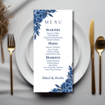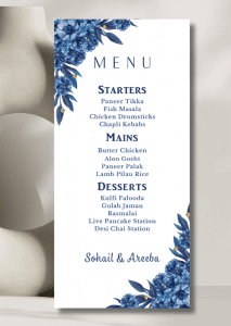 Our elegant Deep Blue Hydrangeas Menu announces all the dining details in store for your beloved guests. This beautiful design features deep blue hydrangeas framing the details.