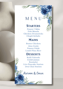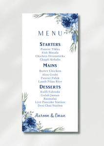 Our elegant Azure x Golden Hints Menu announces all the dining details in store for your beloved guests. This beautiful design features azure blue floral arrangements.