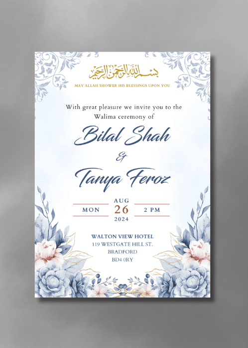 Our Blue Blooms Wedding Invitation is a lovely way to welcome your loved ones on your special day. The delicate balance of soft blues and blush pinks in the watercolour floral arrangement with gold accents subtly interwoven throughout the design.