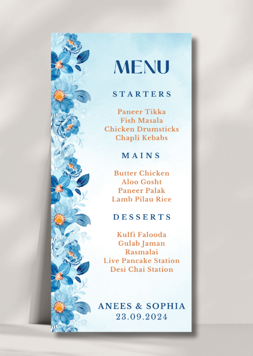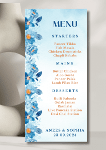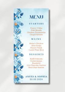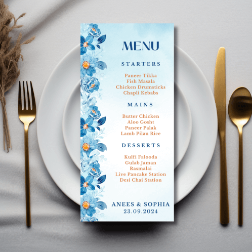 Our elegant Blue Hues x Floral Menu announces all the dining details in store for your beloved guests. This beautiful design features blue floral watercolour illustrations framing the details.