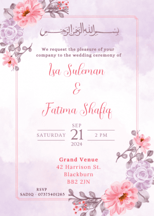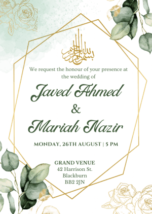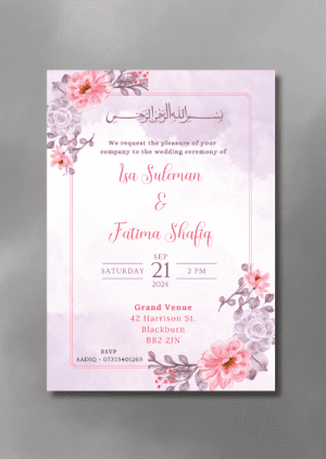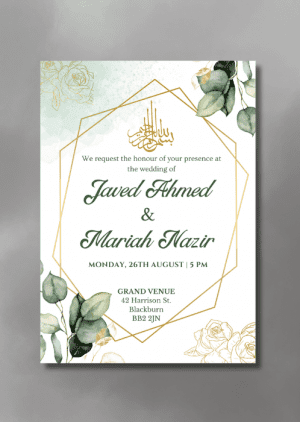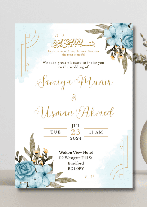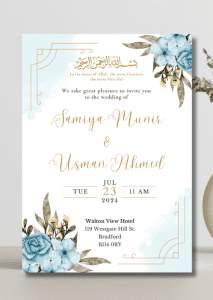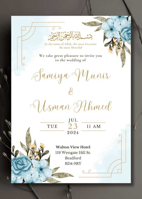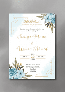 Set the tone for your upcoming wedding with our Blue Rose Golden Gate Wedding Invitation. The washes of blue and green reminiscent of a summer sky with the elegant floral motifs rendered in muted tones.
