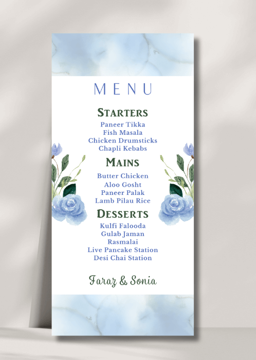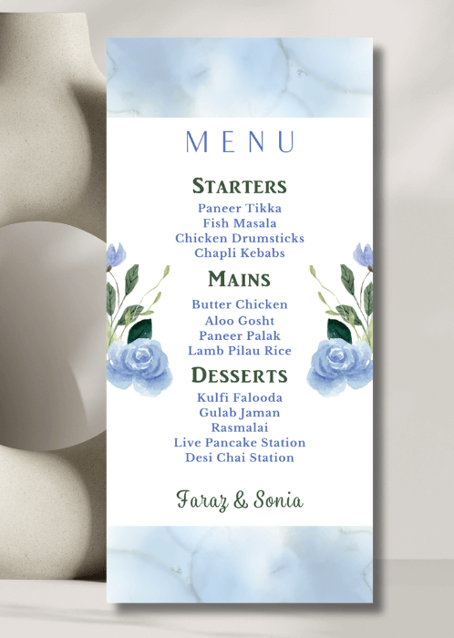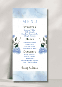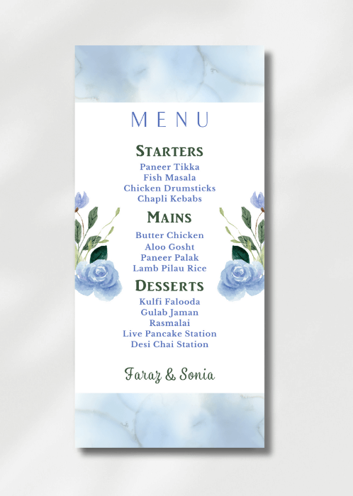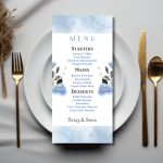 Our elegant Blue Soft Wash Menu announces all the dining details in store for your beloved guests. This beautiful design features florals in ethereal blue washes.