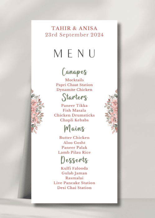 The card delicately displays your names and wedding date before disclosing the delicious details of your canapes, starters, main course and dessert options.