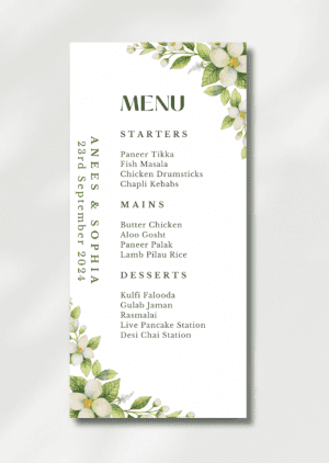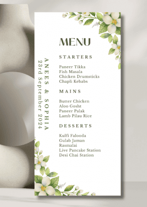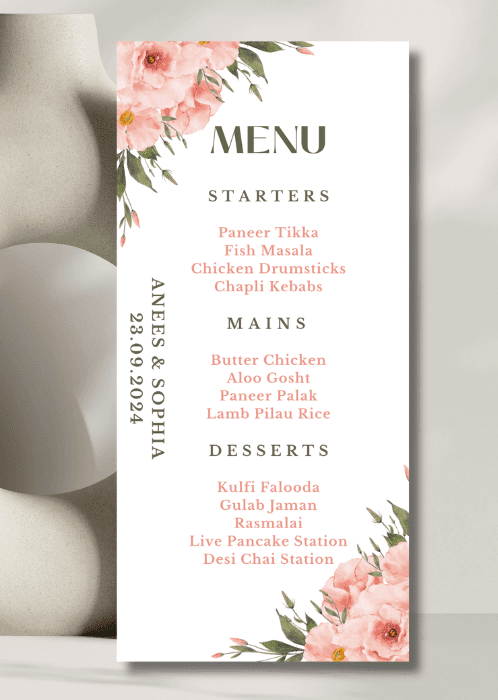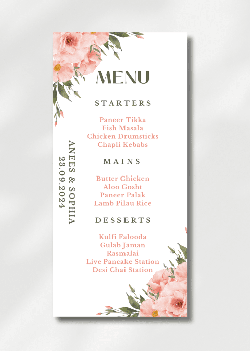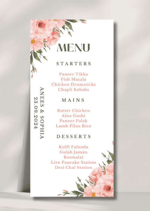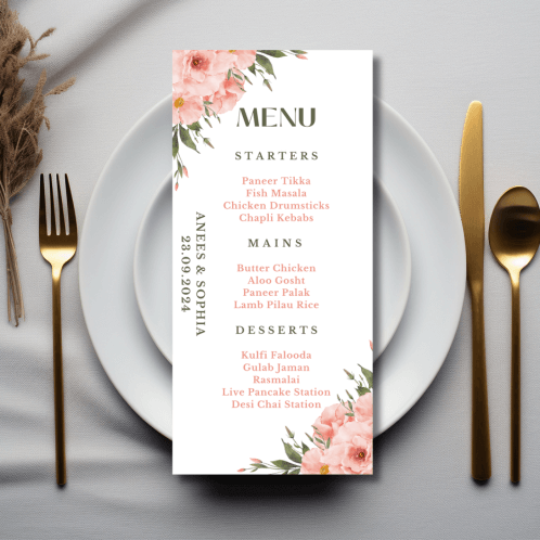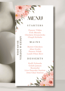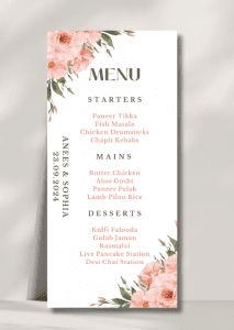 The card delicately displays your names and engagement date before disclosing the delicious details of your starter, main course and dessert options.