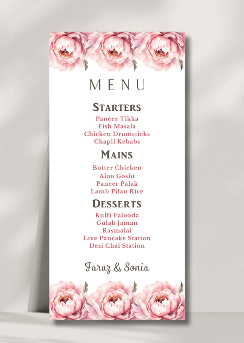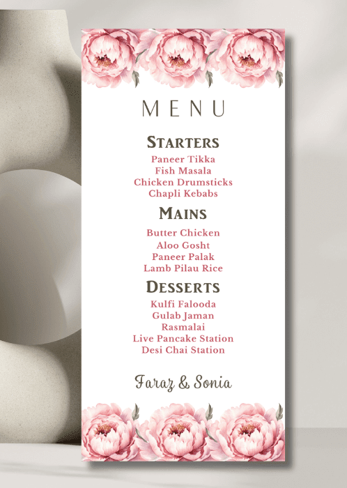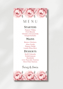 The card delicately displays your names along with the delicious details of your starter, main course and dessert options.