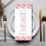 Our elegant Blushing Pink Hues Menu announces all the dining details in store for your beloved guests. This beautiful design features delicate pink florals framing the details.