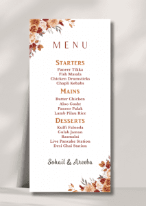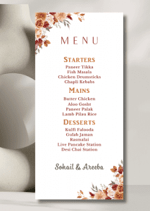 The card delicately displays your names along with the delicious details of your starter, main course and dessert options.