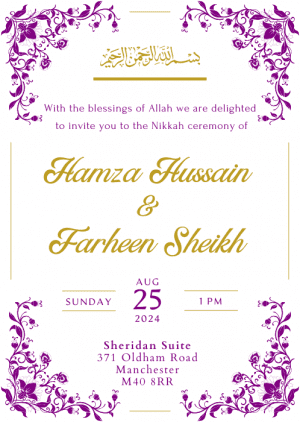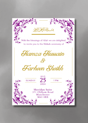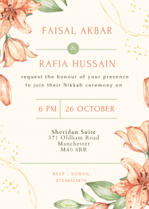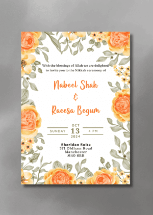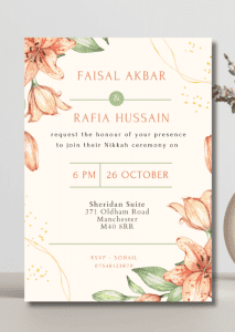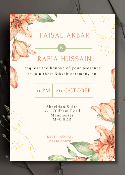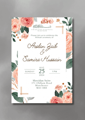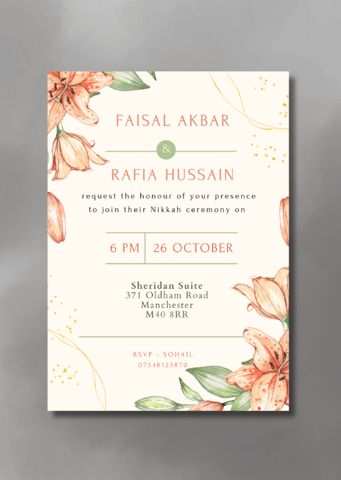 Set the tone for your upcoming wedding with our Coral Lilies Nikkah Invitation. This design features delicate lilies rendered in blush and coral hues.