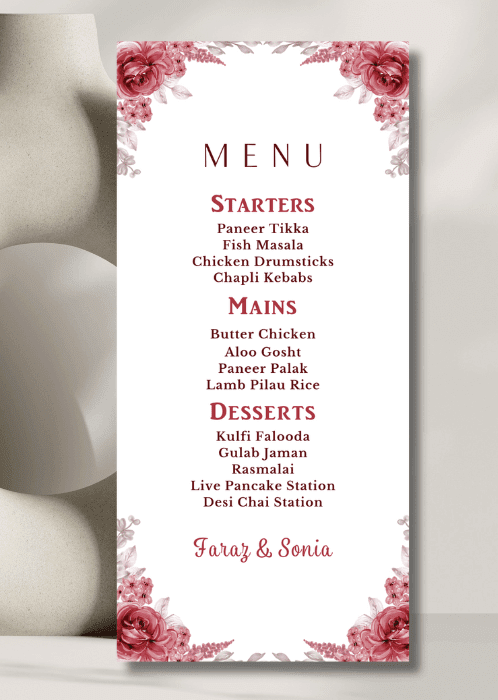 The card delicately displays your names along with the delicious details of your starter, main course and dessert options.