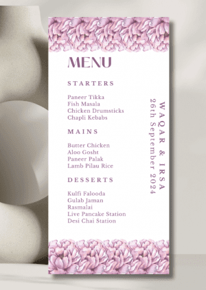 Our elegant Crimson x Bougainvillea Menu announces all the dining details in store for your beloved guests. This beautiful design features vibrant crimson bougainvillea cascading down the sides.