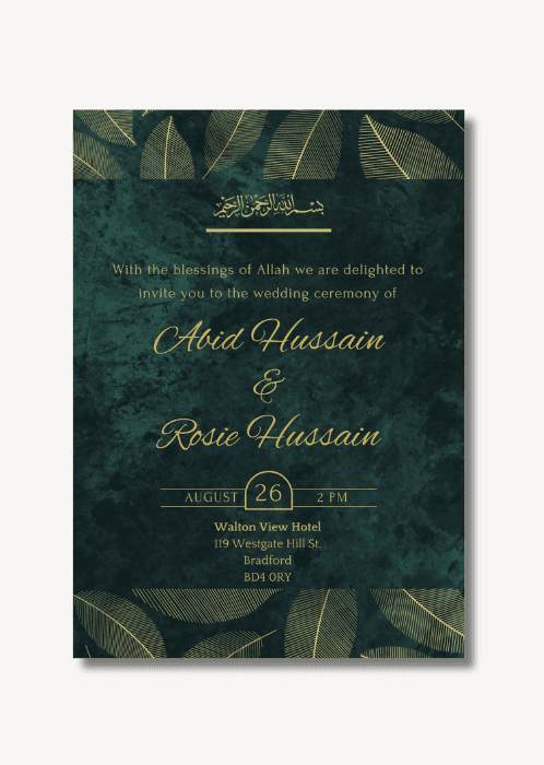 Announce all the official details with our Golden Leaf x Emerald Wedding Invitation. This design features a deep emerald green backdrop with intricate gold leaf patterns.