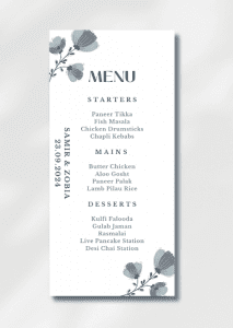 The card delicately displays your names and wedding date before disclosing the delicious details of your starter, main course and dessert options.