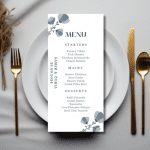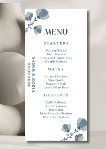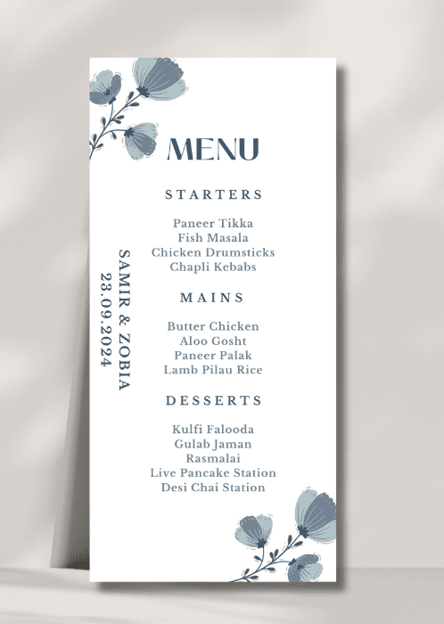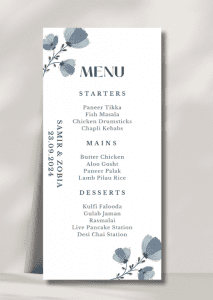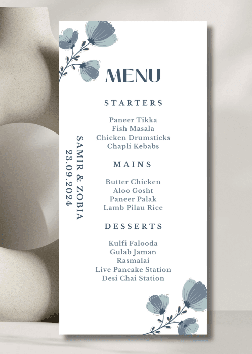 Our elegant Deep Blue Motifs Menu announces all the dining details in store for your beloved guests. This beautiful design features delicate floral motifs framing the details.