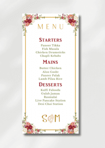 The card delicately displays your initials along with the delicious details of your starter, main course and dessert options.