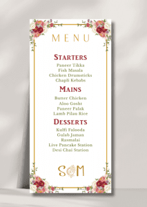 Our elegant Deep Crimson x Floral Menu announces all the dining details in store for your beloved guests. This beautiful design features delicate watercolour flowers in blush pink and deep crimson framing the golden borders.