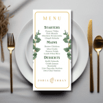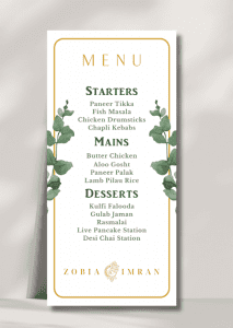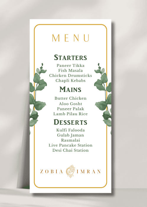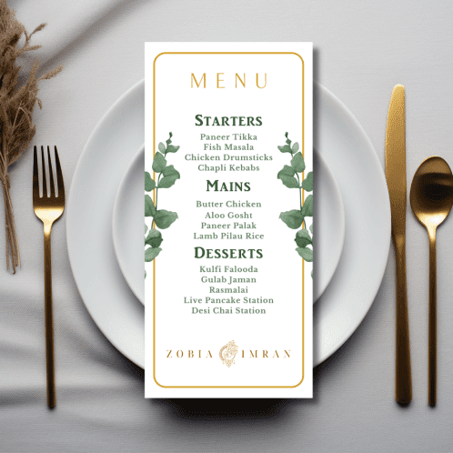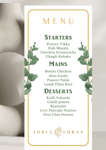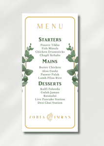The card delicately displays your names along with the delicious details of your starter, main course and dessert options.