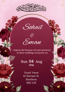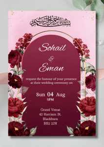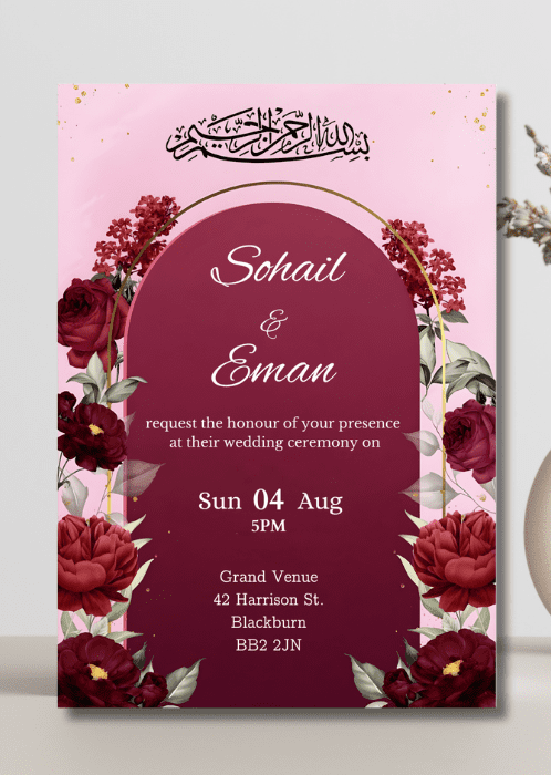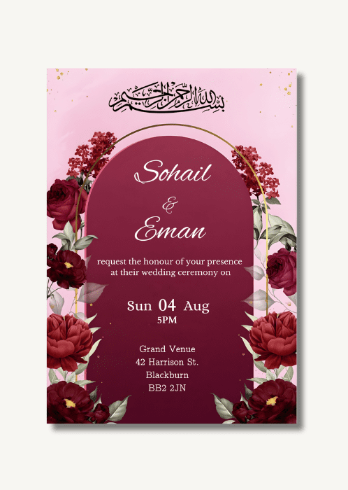 Announce all the official details with our Deep Red Gate Wedding Invitation. This rich burgundy backdrop design surrounded with deep red roses and peonies on an elegant gold frame arching over the details.