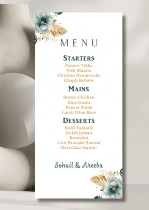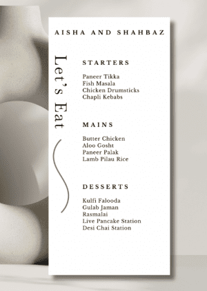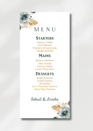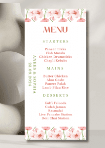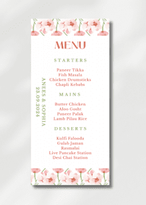 The card delicately displays your names and engagement date before disclosing the delicious details of your starter, main course and dessert options.