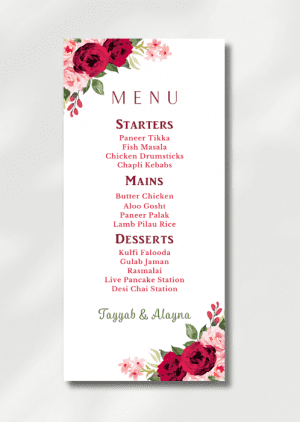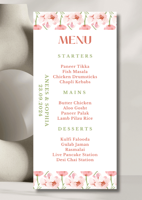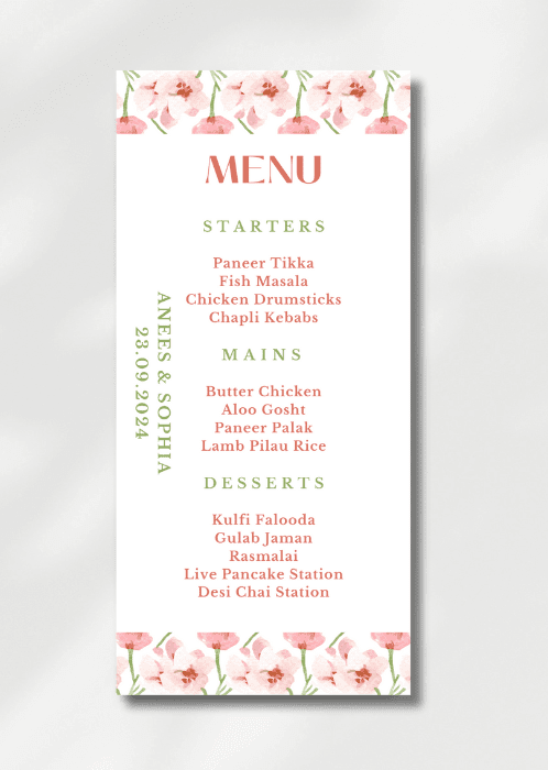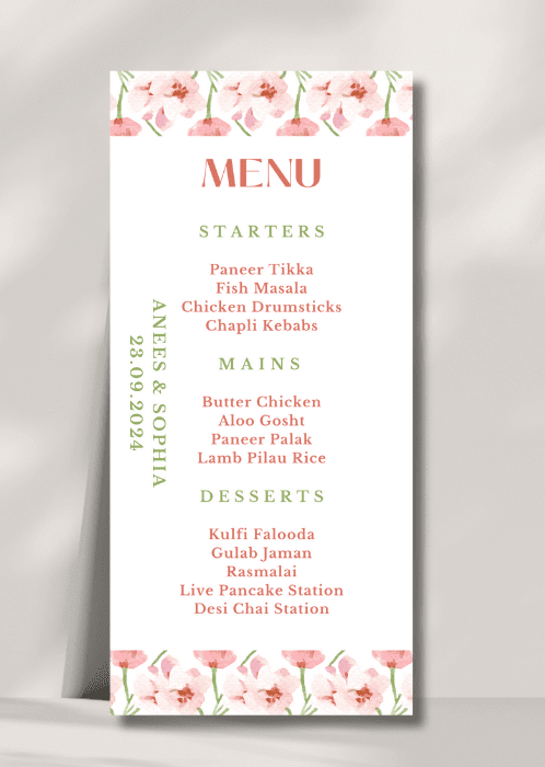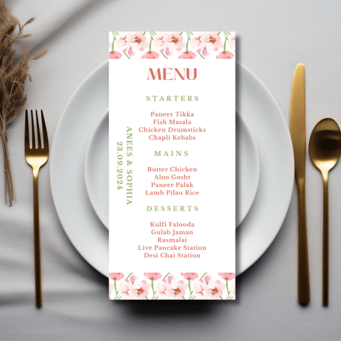 Our Delicate Pink Blossoms Menu announces all the dining details in store for your beloved guests. This beautiful design features delicate pink watercolour blossoms framing the details.