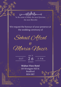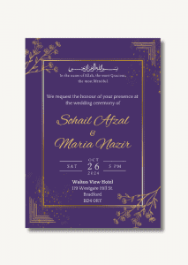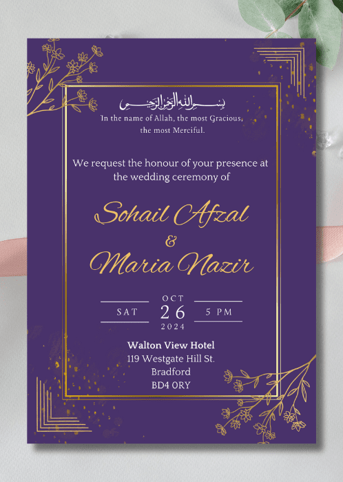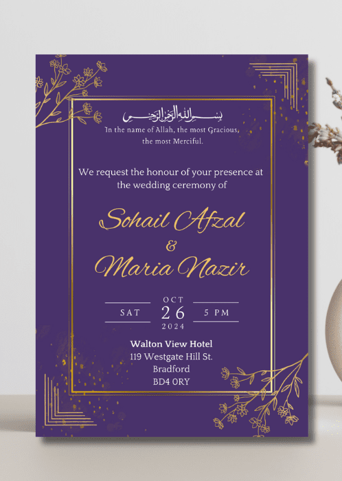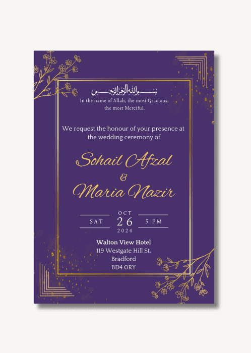 Announce all the official details with our Purple x Golden Gate Wedding Invitation. This design features a rich purple backdrop surrounded with delicate golden botanical illustrations framing the details.