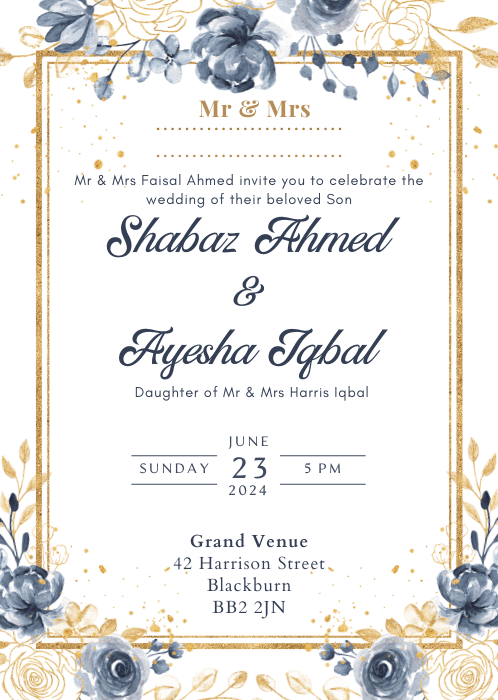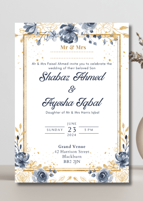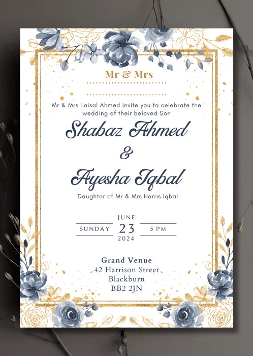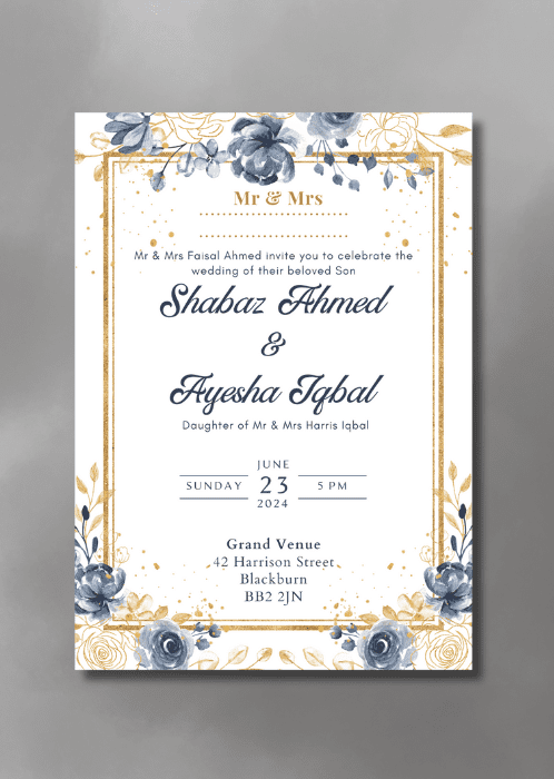 Announce all the official details with our Dusty Blue Motifs (Mr&Mrs Guest) Wedding Invitation. This invitation features floral motifs in a palette of dusty blue and gold with a gold frame.