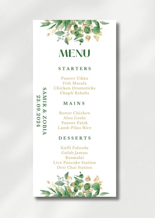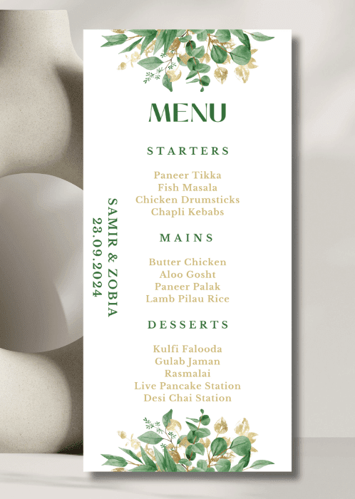 Our elegant Earthy Green Hues Menu announces all the dining details in store for your beloved guests. This beautiful design features earthy green hues with delicate gold accents.