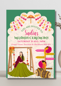 Welcome your guests in style with our elegant Emerald x Marigold Mehndi Invitation. This design features a vibrant colour palette dominated by emerald green and fuchsia.