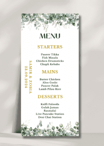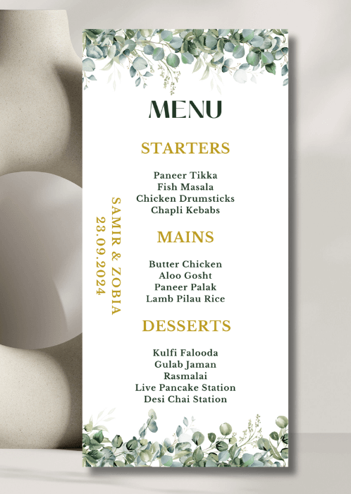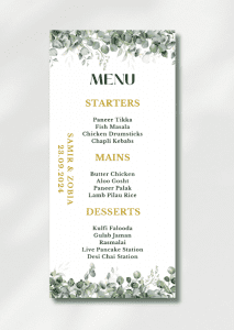 Our elegant Eucalyptus Trim Menu announces all the dining details in store for your beloved guests. This beautiful design features delicate watercolour eucalyptus branches rendered in soft greens framing the details.