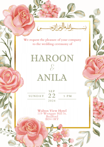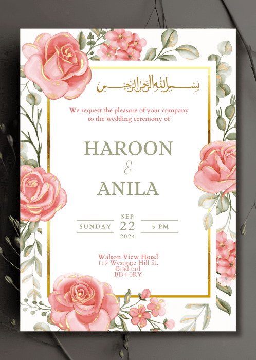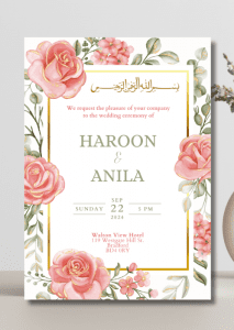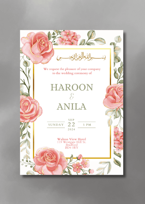 Set the tone for your upcoming wedding with our Floral Cascade Wedding Invitation. This invitation consists of delicate pink roses with gold edges and gold accents.