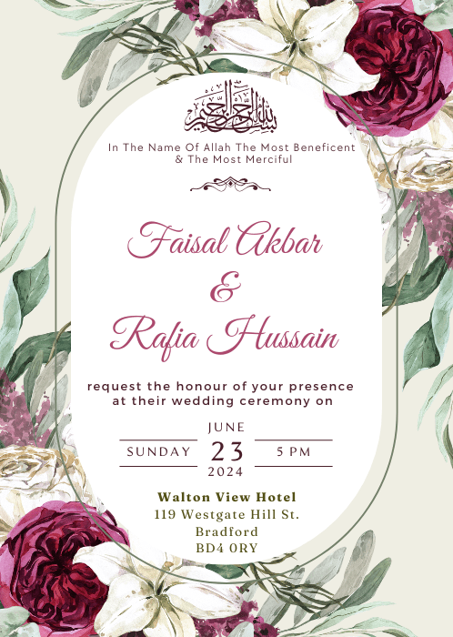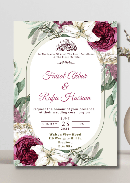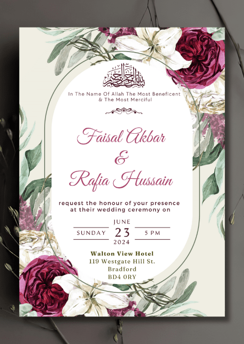 Announce all the official details with our Floral Elegance Wedding Invitation. This invitation features delicate flowers in a palette of blush pinks, deep burgundies and verdant green framing the details.