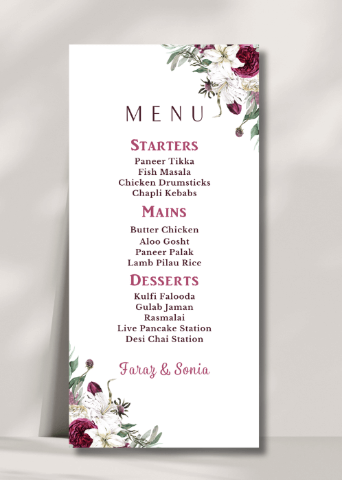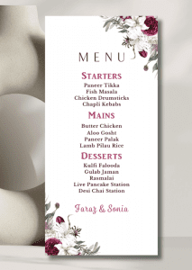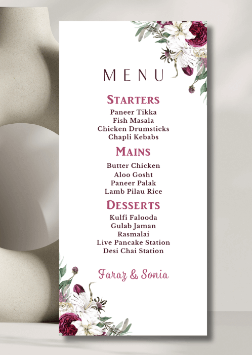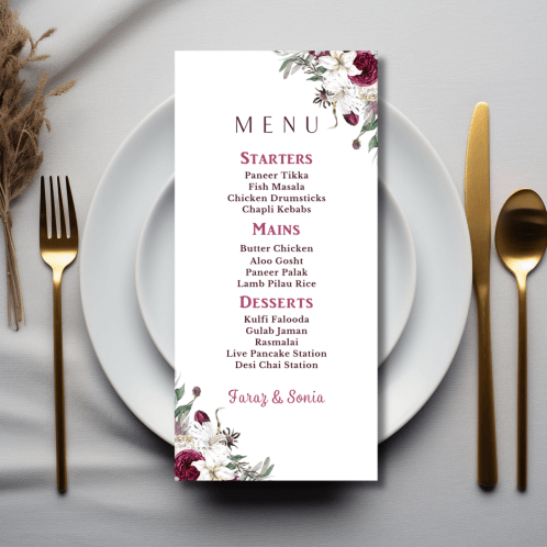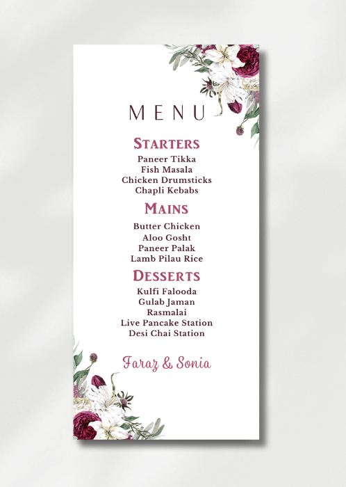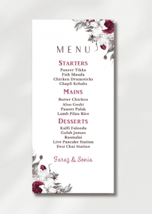 The card delicately displays your names along with the delicious details of your starter, main course and dessert options.