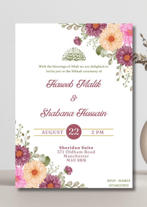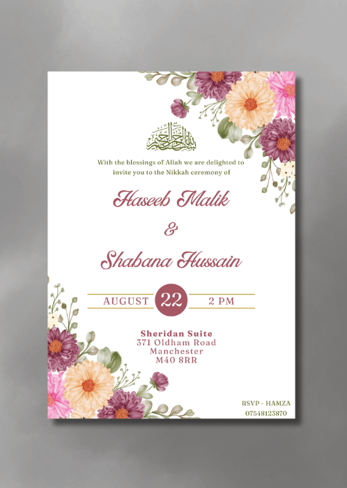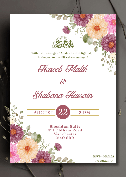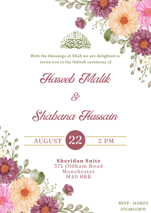 Announce all the official details with our Floral Tapestry Nikkah Invitation. This design features delicate watercolour flowers rendered in soft pinks, peaches and deep maroons framing the details like a floral tapestry.