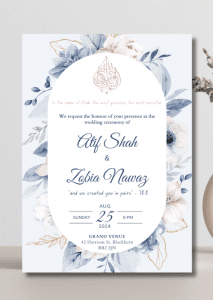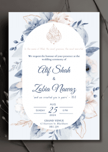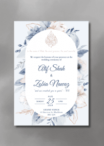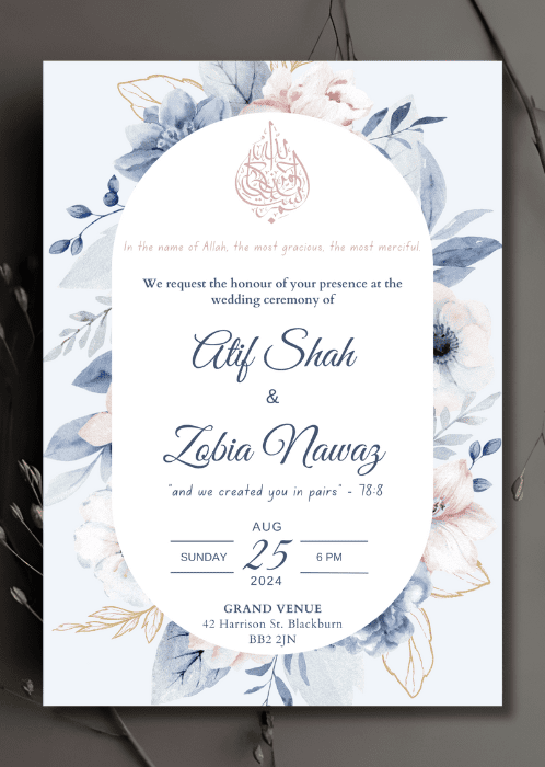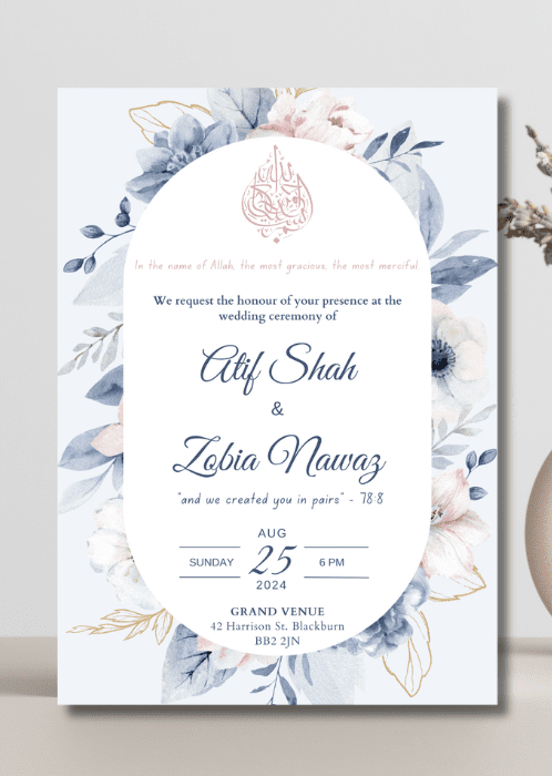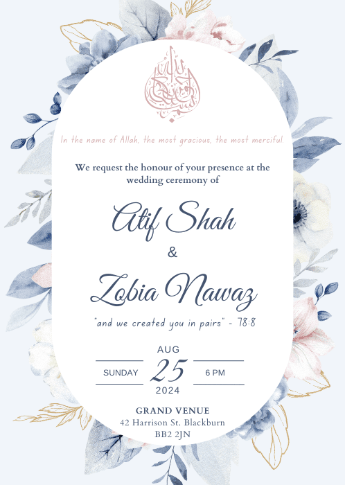 Announce all the official details with our Floral Trim (Pink Bismillah Emblem) Wedding Invitation. The soft muted palette of dusty blues and blush pinks with delicate watercolour flowers.