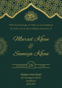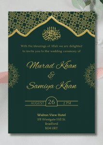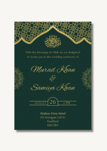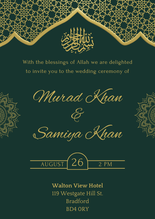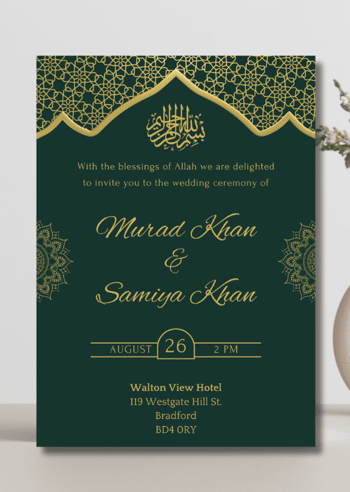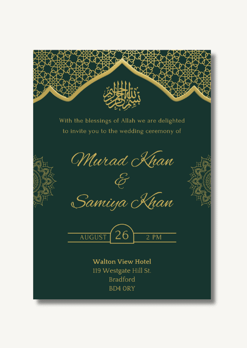 Set the tone for your upcoming wedding with our Golden Mandalas Wedding Invitation. This design features a deep emerald green backdrop with intricate gold mandalas bordering the details.