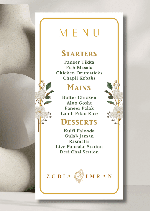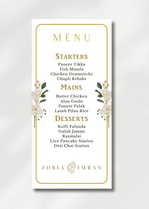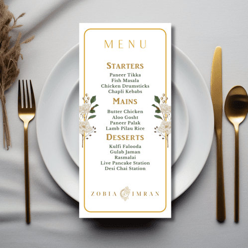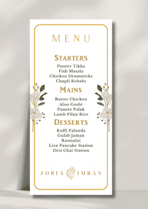 The card delicately displays your names along with the delicious details of your starter, main course and dessert options.