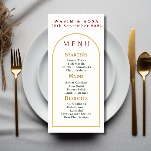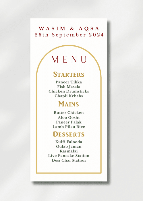 Our elegant Golden Arch Menu announces all the dining details in store for your beloved guests. This beautiful design features a minimal golden arch framing the details.