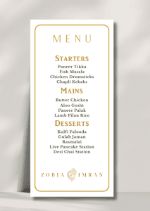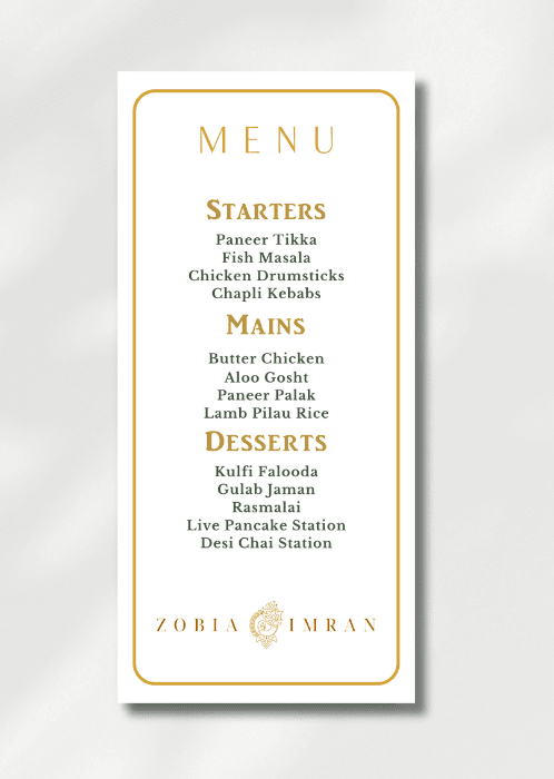 The card delicately displays your names along with the delicious details of your starter, main course and dessert options.