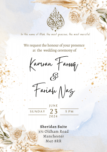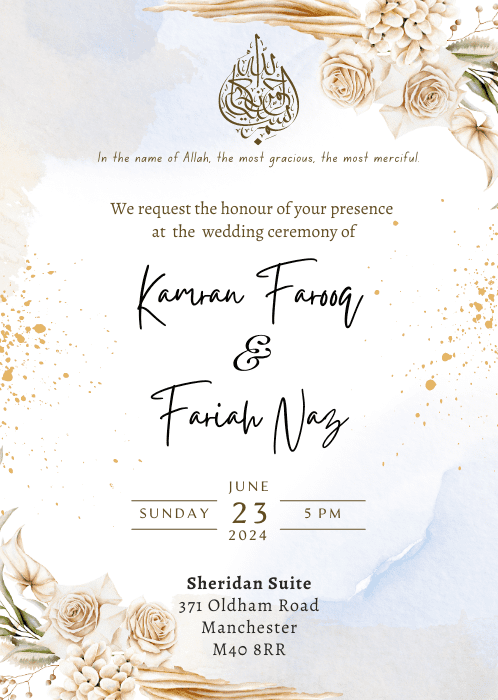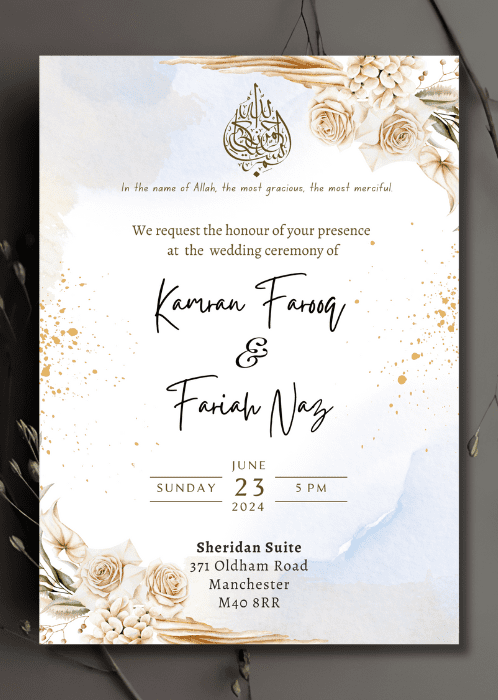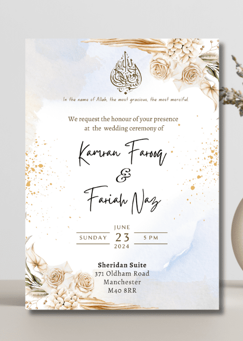 Our Golden Hints Wedding Invitation is a lovely way to welcome your loved ones on your special day. This invitation features ethereal floral tones – whites, creams, blues and hints of gold.