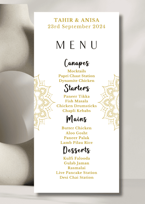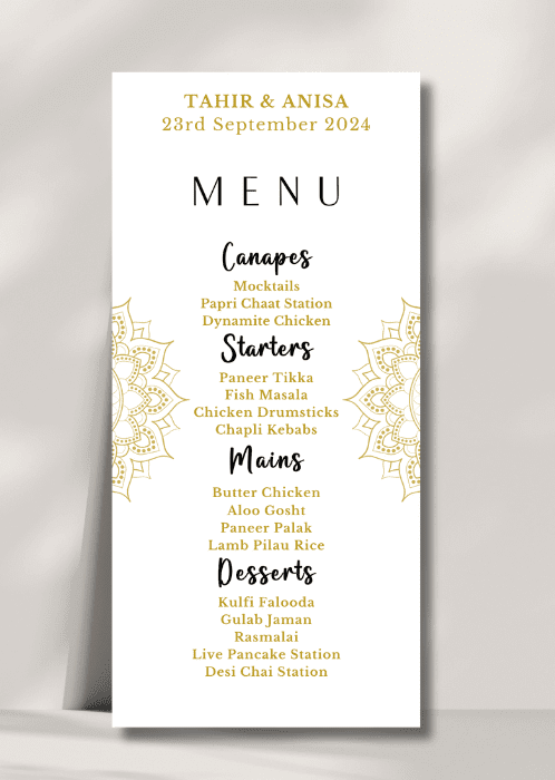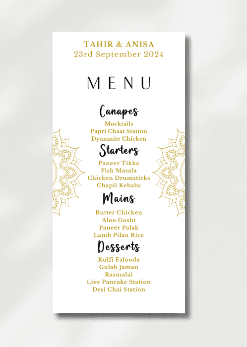 Our elegant Golden Mandalas Menu announces all the dining details in store for your beloved guests. This beautiful design features intricate gold mandalas bordering the details.
