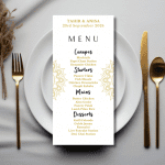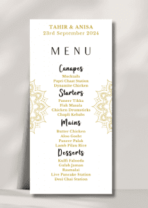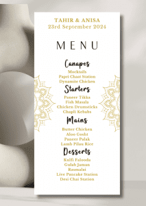 The card delicately displays your names and wedding date before disclosing the delicious details of your canapes, starters, main course and dessert options.