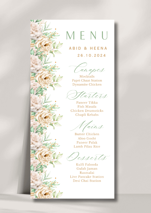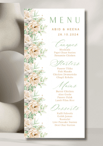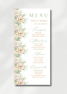 The card delicately displays your names and wedding date before disclosing the delicious details of your canapes, starters, main course and dessert options.