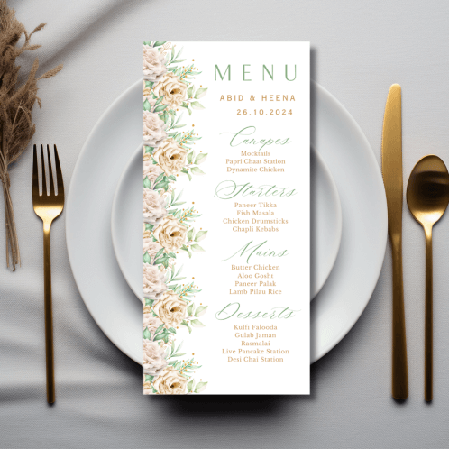 Our elegant Golden Opulence Menu announces all the dining details in store for your beloved guests. This beautiful design features delicate watercolour roses rendered in a palette of ivory and blush with subtle gold accents throughout the design.