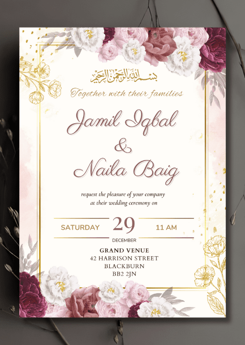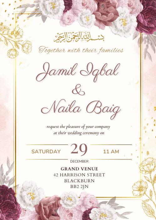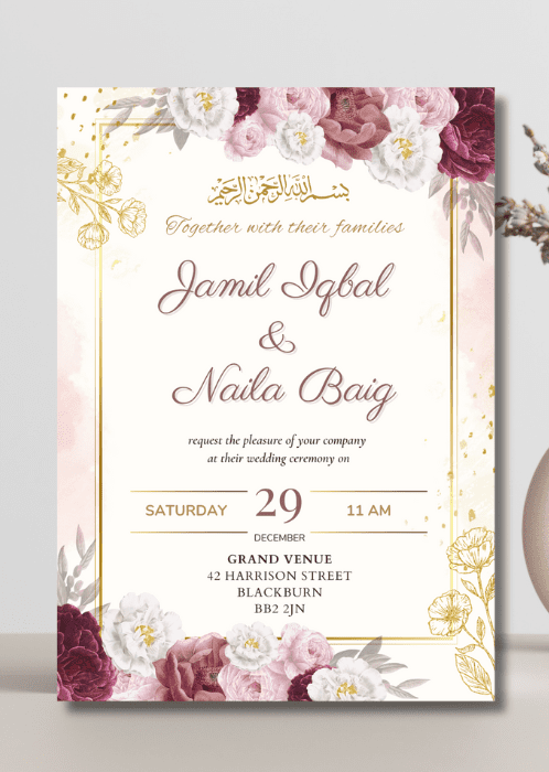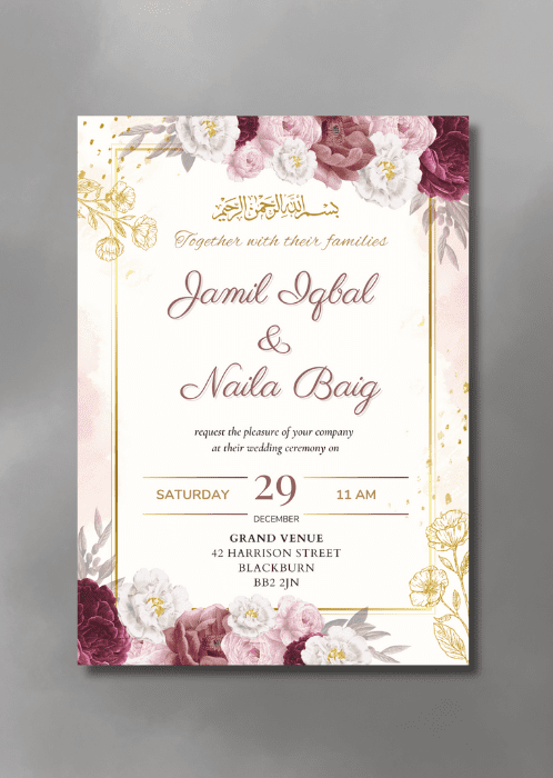 Set the tone for your upcoming wedding with our Golden Specks Wedding Invitation. The delicate watercolour flowers rendered in shades of blush pink and deep burgundy placed around the golden frame.