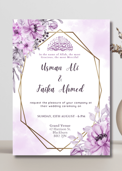 Welcome your guests in style with our elegant Lavender Floral Frame Wedding Invitation. This invitation features a geometric frame with a delicate floral arrangement in muted purples with soft watercolour washes of lavender and white.
