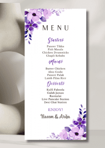 Our elegant Lavender Royal Menu announces all the dining details in store for your beloved guests. This beautiful design features soft lavender blossoms framing the details like a floral embrace.