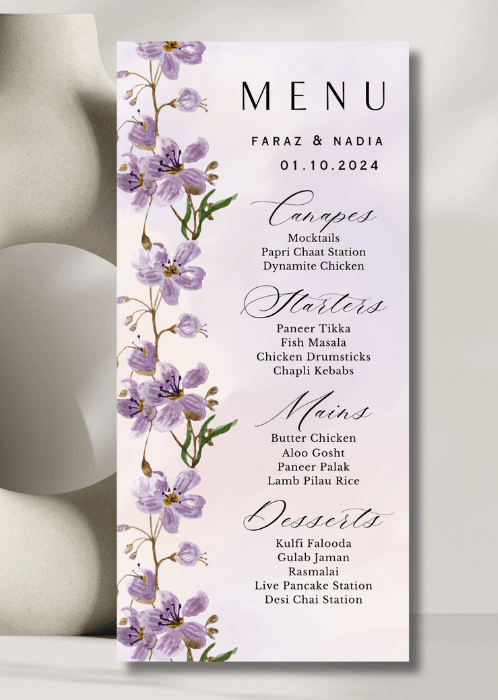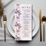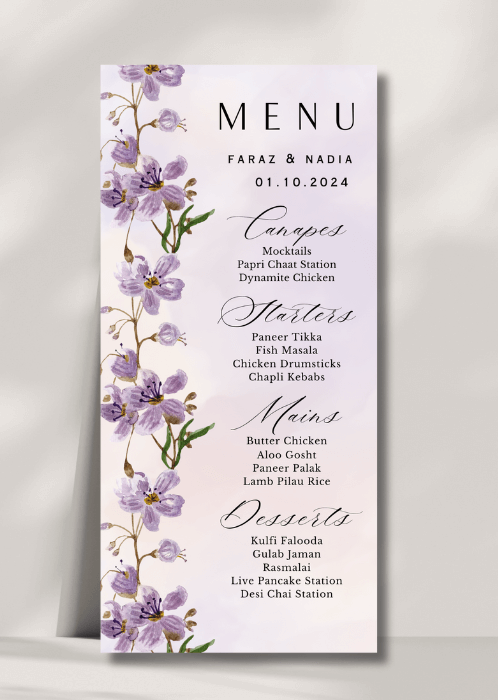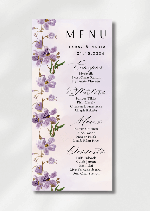 Our elegant Lavender Soft Wash Menu announces all the dining details in store for your beloved guests. This beautiful design features soft watercolour washes of lavender in the background with delicate purple flowers framing the details.