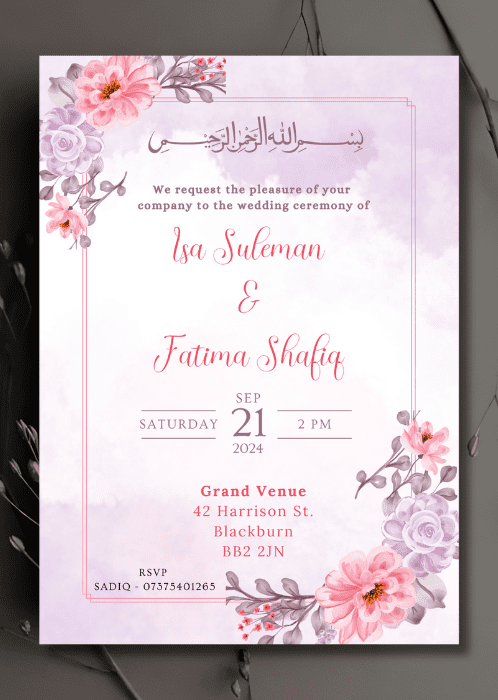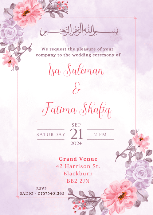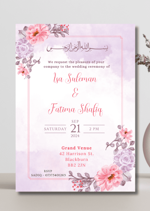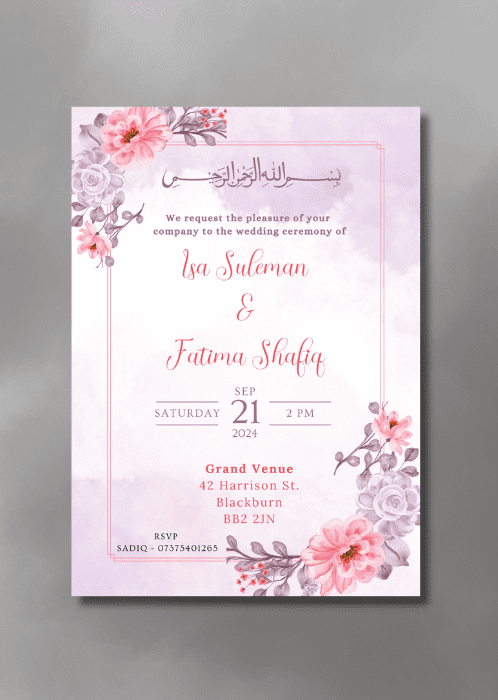 Our Lilac Pastel Hues Invitation is a lovely way to welcome your loved ones on your special day. The soft pastel hues of pink and purple in the floral borders rendered in a style reminiscent of watercolour painting.